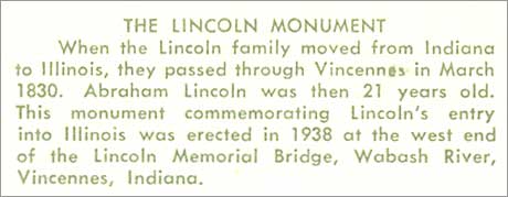 The next postcard shows the Lincoln Monument near Vincennes, Indiana. This monument depicts the Lincoln family moving from Indiana to Illinois in 1830 when Lincoln was 21 years old.